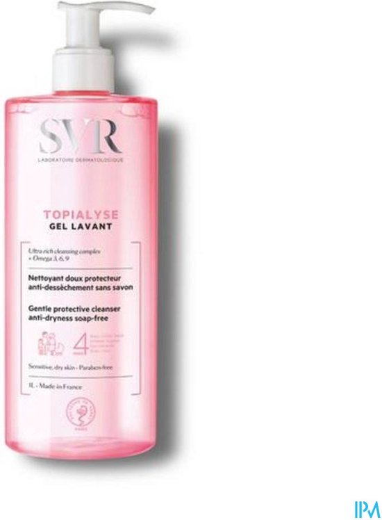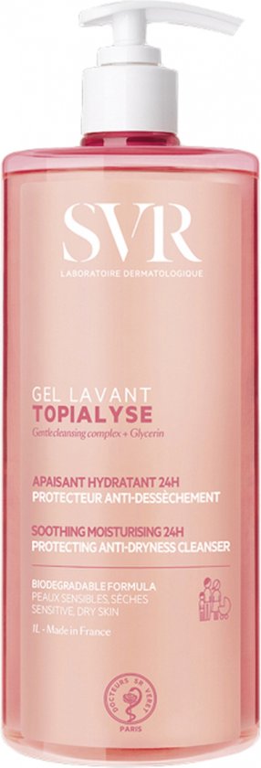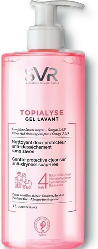SVR Topialyse Wasgel 1 L is een zachte, zeepvrije, anti-uitdrogende reinigingsgel die de gevoelige, droge huid van het gezicht en het lichaam van het hele gezin vanaf de geboorte op milde wijze reinigt en beschermt (met uitzondering van premature baby’s). Het helpt het kriebelende gevoel te verminderen voor een gekalmeerde, gladdere huid en langdurig comfort. Het is ook geschikt voor de hoofdhuid. De zachte, zeepvrije reinigingsbasis met een fysiologische pH-waarde droogt de huid niet uit en prikt niet in de ogen.Biologisch afbreekbare formule. Getest onder dermatologisch, oftalmologisch, gynaecologisch en pediatrisch toezicht.Hypoallergeen. Gemaakt in Frankrijk.