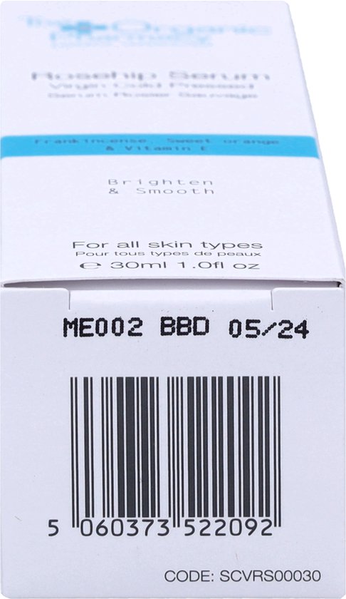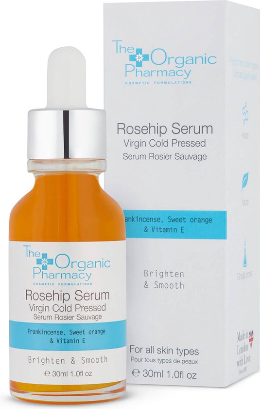 The Organic Pharmacy Virgin Rosehip Serum op basis van rozenbottel, sinaasappel en frankincense olie is rijk aan antioxidanten, waaronder vitamine A, C , E en Omega 3, 6, 7 en 9. Deze vitamine boost herstelt en repareert schade aan de huid zoals pigmentvlekken en striae. Behandelt vroegtijdige huidveroudering en verheldert de teint.