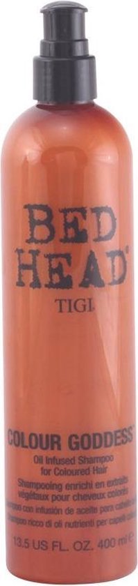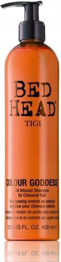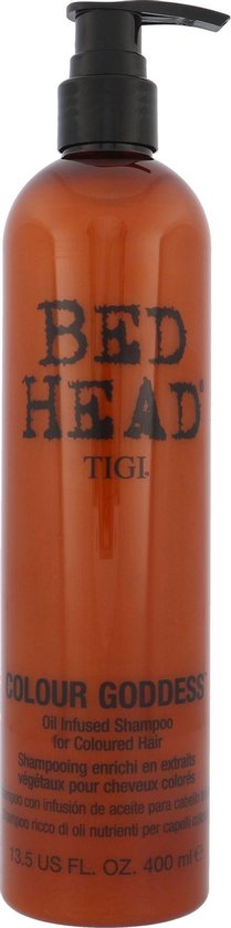 Tigi Bed Head Colour Goddess Oil Infused Shampoo Beschermt uw donker gekleurde haar tegen vervaging De shampoo is verrijkt met pro vitamine B5 vitamine E verzorgende amandelolie kokosolie en keratine De shampoo laat uw kleur glanzen en zorgt ervoor dat uw haar gehydrateert en zacht is Zowel de 400ml als de 750ml worden geleverd zonder pomp Gebruiksaanwijzing op nat haar inmasseren vervolgens uitspoelen Voor het beste resultaat vervolgens gebruik maken van de Colour Goddess conditioner