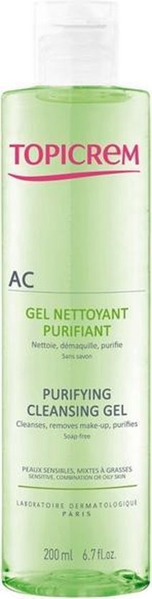 Topicrem AC Purifying Cleansing Gel Reinigende Zuiverende Gel Deze AC reinigende zuiverende gel is ontwikkeld voor de gevoelige gemengde tot vette huid De gel reinigt verwijdert make up zuivert de huid elimineert onzuiverheden en overtollig talg Zonder zeep en parabenen Gebruik Breng de gel aan op de vochtige hals en het gezicht laten schuimen en vervolgens afspoelen