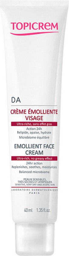 Topicrem DA Emollient Face Cream is een verzachtende crème voor de gevoelige, zeer droge en atopische huid. Geschikt voor baby’s, kinderen en volwassenen. De geurvrije formule met hoge tolerantie bevat vlasolie dit is rijk aan omega 3 en 6. Deze zorgen ervoor dat de hydrolipidenfilm intens hersteld wordt. Allantoïne om kalmeert jeuk en verlicht de geïrriteerde huid. De crème heeft een niet vette en niet plakkerige formule.