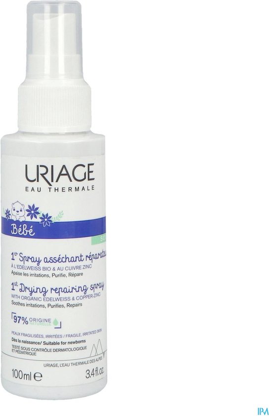 Uriage Baby 1st Drying Repairing Spray bevat een unieke combinatie van Uriage Thermal Water en biologische edelweiss met de gepatenteerde TLR2- Régul technologie, een formule die irritatie bij baby’s verzacht en verlicht. De spray bevat koper en zink die anti-bacteriële eigenschappen en een zuiverende werking hebben. Ook is er groene klei toegevoegd die overtollig vocht absorbeert zodat de aangetaste huid sneller kan genezen. Uriage Baby 1st Drying Repairing SprayVerzacht en verlicht irritatie bij baby’sOp basis van Uriage Thermal Water en biologische edelweissMet de gepatenteerde TLR2 Régul technologieVerrijkt met koper en zinkNatuurlijke groene klei absorbeert vocht97% ingrediënten van natuurlijke oorsprongGetest onder toezicht van dermatologen en kinderartsenBelangrijkste ingrediëntenUriage Thermal Water en biologische edelweiss (Beschermt en verzacht de delicate babyhuid)Gepatenteerde TLR2-Régul technologie (Verlicht irritatie)Koper en zink ( hebben een anti-bacteriële en zuiverende werking)Groene klei (absorbeert overtollig vocht)Hoe te gebruiken?Het flesje goed schudden voor gebruik. Spray vervolgens op de (droge en schone) geïrriteerde huid Laat goed intrekken zonder het af te vegen. Vermijd contact met de oogjes.