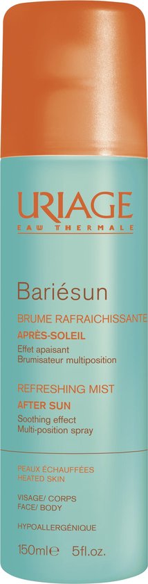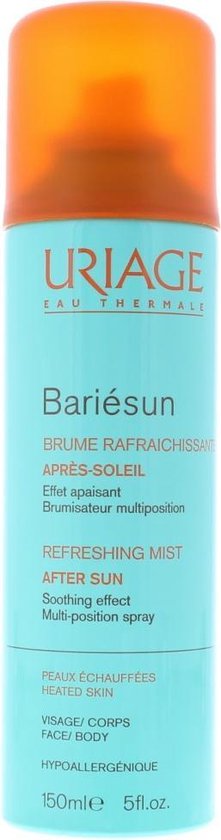 Uriage BariA c sun Brume Rafraichissante AprA c s Soleil Een subtiel geparfumeerde frisse mist om de door de zon verhitte en uitgedroogde huid te verzachten De lichte formule is verrijkt met Aquaspongines om het vochtniveau in de huid op peil houden De huid is gekalmeerd en blijft langer bruin Gebruik royaal verstuiven en egaal uitstrijken Zo vaak als nodig opnieuw aanbrengen