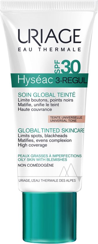 De Uriage Hyséac 3-Regul Soin Global Teinte SPF30, zullen onzuiverheden sneller verdwijnen en wordt de teint geëgaliseerd. Puistjes en zwarte puntjes (mee-eters) verdwijnen sneller, daarnaast wordt het ontstaan van restlittekens als gevolg van blootstelling aan de zon beperkt dankzij de UVA- en UVB-filters. Doordat deze formule getint is, wordt jouw teint op een natuurlijke wijze geëgaliseerd en zijn puistjes minder zichtbaar. Ook het poederachtige effect van de crème gaat het glimmen tegen, omdat dit product zoethoutextract bevat wordt het talgoverschot beperkt en blijft de huid ook langer mat. GebruikJe kunt de Uriage Hyseac 3-Regul Global Tinted Skin-care SPF30 dagelijks gebruiken. Reinig en droog je gezicht voordat je deze crème ’s ochtends aanbrengt. Let op: Vermijd contact met de ogen. Actieve bestanddelenThermaal Water van Uriage, Zoethoutextract, Matterend bestanddeel EigenschappenLicht geparfumeerdVrij van parabenenHypoallergeenNiet-comedogeenIngrediëntenAqua (water, eau), di-c12-13 alkyl malate, dicaprylyl ether, polymethylmethacrylate, tapioca starch, glycolic acid, sodium hydroxide, diglycerin, glycerin, malic acid, steareth-2, steareth-21, lactic acid, pentaerythrityl distearate, butylene glycol, acrylates/c10-30 alkylacrylate crosspolymer, jojoba esters, dimethicone, glyceryl stearate, parfum (fragrance), peg-100 stearate, propanediol, tocopherylacetate, polyglycerin-3, piroctone olamine, xanthan gum, phytosphingosine, lens esculenta (lentil) fruit extract, polymethylsilsesquioxane, salicylic acid, zinc lactate, asiaticoside, acacia decurrens flower cera (acacia decurrens flower wax), helianthusannuus (sunflower) seed wax, phenoxyethanol, glycyrrhiza inflata root extract, ethylhexylglycerin, rhamnose, glucose, glucuronic acid.