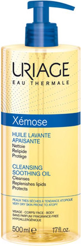 Uriage Xemose Huile Lavante Apaisante Cleansing Soothing Oil Deze reinigingsolie zonder parfum is bedoeld voor de zeer droge huid met neiging tot atopie Deze olie beschermt jouw huid tegen uitdroging verzacht de jeuk en laat ook een beschermlaag achter op de huid Gebruik Breng de olie aan op de natte huid en laat het schuimen spoel het vervolgens af en dep de huid voorzichtig droog