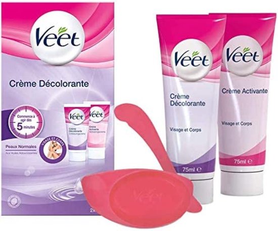 DERMATOLOGISCH GETEST: Veet Ontkleuringscrème is een gemakkelijke en prettige manier om haartjes te maskeren die je niet wilt verwijderen. Bevat 75ml tube roze activeringscrème, 75 ml tube witte ontkleuringscrème, 1 mengschaaltje, 1 Spatel