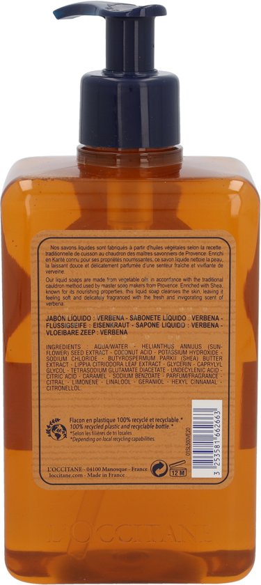 Deze vloeibare hand en lichaamszeep werkt reinigend en kalmerend De zeep is verrijkt met Shea boter wat hydraterend en verzachtend werkt Het product is palmolievrij De huid wordt subtiel geparfumeerd met een frisse verbena geur Gebruik Breng een kleine hoeveelheid zeep aan in de handpalm en breng dit aan op de vochtige huid Masseer dit zachtjes in en spoel het tot slot grondig af