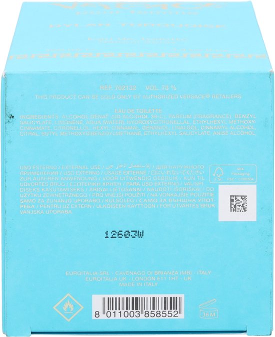 Levendig en speels, traditioneel en innovatief; Dylan Turquoise vult de familie van de Versace damesgeuren perfect aan. Een verleidelijke geur met onder andere Siciliaanse mandarijn, roze peper en witte muskus. Ervaar met Dylan Turquoise het zelfvertrouwen en de elegantie van de krachtige Versace vrouw! Versace Dylan Turquoise neemt u mee naar een ver eiland waar de blauwe lucht het heldere water ontmoet. De zeebries streelt de huid die de zintuigen wakker maakt en de ziel herstelt. Een geur die doet denken aan de warme, zonnige zomerdagen.