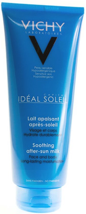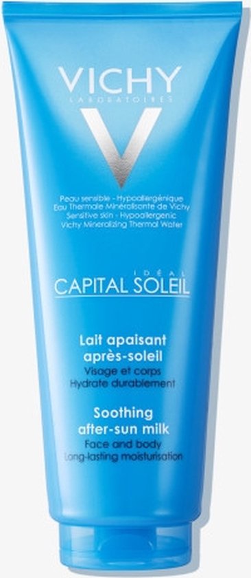 De Capital Soleil Aftersun Melk van Vichy is een hydraterende aftersun verzorging voor een gevoelige huid. Verrijkt met hydraterend Natriumhyaluronaat en een plantaardig lipidenconcentraat met verzachtende eigenschappen, houdt deze verzorging het vocht vast en hydrateert intensief de huid die uitgedroogd is door de zon. De huid voelt gekalmeerd en gevoed aan. De hypoallergene formule is dermatologisch getest op een gevoelige huid.