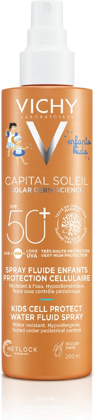 CELL PROTECT WATER FLUID SPRAY SPF 50+ van Vichy biedt geavanceerde bescherming op vier niveaus (UVB, UVA, lange UVA en antioxidanten) om schadelijke effecten van de zon te helpen voorkomen.De ultralichte formule met de gepatenteerde* Netlock-technologie vormt een geavanceerde beschermende UV-laag met een onzichtbare finish en zonder witte strepen.*Netlock-technologie gepatenteerd door L’Oréal in Frankrijk. HOGE BESCHERMING OP VIER NIVEAUSBESCHERM JE HUID TEGEN ZONNESCHADEIedereen wordt geboren met een ‘zonnekapitaal’. Dit is het beperkte vermogen van de huid om zich te verdedigen tegen UV-straling, waaronder: – UVB: zonnestralen die verantwoordelijk zijn voor verbranding en huidkanker.- UVA: verouderende stralen die leiden tot pigmentvlekken en foto-veroudering.- Lange UVA: hebben een hogere golflengte en dringen dieper door in de huid. Bovendien kunnen UV-stralen leiden tot huidoxidatie. Bij elke blootstelling aan de zon bouwt zich schade op in het huidoppervlak en diep in de cellen. Door de tijd wordt deze schade zichtbaar en hardnekkiger en verliest de huid haar kwaliteit. GEAVANCEERDE UV-BESCHERMENDE LAAGCELL PROTECT WATER FLUID SPRAY is verrijkt met NETLOCK. Netlock is een gepatenteerde* technologie op basis van het emulsieprincipe: UV-filters zijn gevangen in micro geldruppels die een ultradunne, uniforme, resistente en beschermende laag op de huid vormen.*Netlock-technologie gepatenteerd door L’Oréal in Frankrijk. CELL PROTECT WATER FLUID SPRAY biedt geavanceerde bescherming op vier niveaus om de huid te helpen beschermen tegen nadelige effecten van de zon. Capital Soleil CELL PROTECT WATER FLUID SPRAY biedt SPF 50+ en geavanceerde bescherming op vier niveaus (UVB, UVA, lange UVA en antioxidanten) om de huid te helpen beschermen tegen nadelige effecten van de zon. De lichte textuur vormt een ultradun beschermend laagje op de huid dat zeer resistent is tegen water, zand en zweet. VICHY’S TOEWIJDING AAN MEER BESCHERMING VAN HET ONDERWATER ZEELEVEN Onze formules worden meermaals getest in representatieve onderwateromstandigheden om zeker te zijn dat ze niet schadelijk zijn voor het milieu. VOORDELEN: Zeer hoge bescherming tegen UVB en UVA & antioxidantenbescherming.Onzichtbare finish.Dermatologisch getest. Hypoallergene formule.Meer respect voor het onderwaterzeeleven Waterachtige textuur.Onzichtbare finish bij alle fototypen.**0% vet.***0% witte sporen.**** **Getest op 105 mannen en vrouwen, van fototype I tot VI (alle fototypen) en op alle huidtypen.***Resultaat zelfevaluatie door 105 mannen en vrouwen. 70% geeft aan dat het product de huid niet vettig maakt.****Resultaat zelfbeoordeling door 105 mannen en vrouwen. 83% geeft aan dat het product geen witte strepen achterlaat. Verrijkt met de gepatenteerde* NETLOCK-technologie.Met Probiotische fracties, Hyaluronzuur en Vulkanisch water. *Netlock-technologie gepatenteerd door L’Oréal in Frankrijk. Hyaluronzuur: hydrateert de huid opnieuw.Vulkanisch Water van Vichy: Rijk aan 15 essentiële mineralen, versterkt de huidbarrière.Probiotische fracties: Versterkt de barrièrefunctie van de huid.