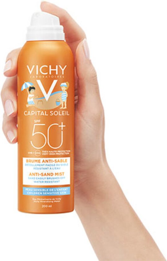 De Capital Soleil Kids SPF50+ Anti-Zand zonnespray is een zonbescherming voor kinderen die helpt voorkomen dat zand aan de huid blijft kleven. Verrijkt met Vichy Vulkanisch Water helpt deze zonnespray de huid te hydrateren en vrije radicalen, veroorzaakt door blootstelling aan de zon, te bestrijden. De spray plakt niet, is prettig aan te brengen en zorgt voor een droge finish waardoor zand gemakkelijk van de huid kan worden geborsteld en niet blijft plakken. Zichtbaar bij het aanbrengen voor een volledige dekking voor een optimale bescherming tegen de zon. De hypoallergene formule is geschikt voor een zeer gevoelige huid. Onder dermatologisch toezicht getest.