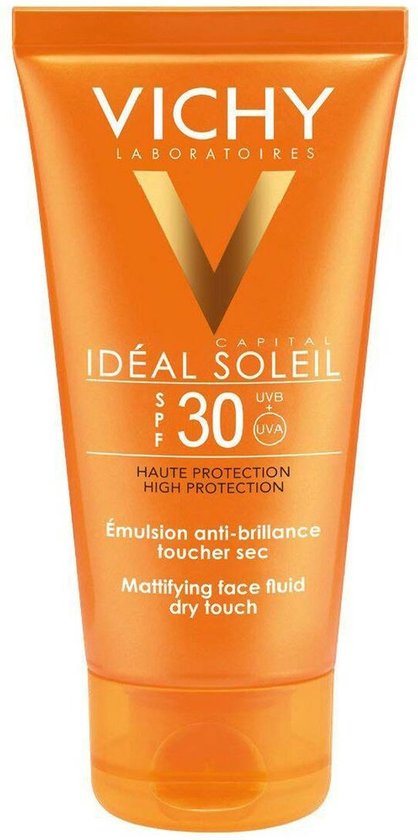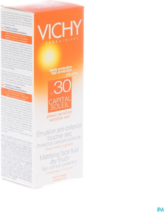 Vichy’s Capital Soleil SPF30 Zonnecrème Dry Touch is een zonneproduct voor het gezicht met hoge beschermingsfactor spv 30, dat droog aanvoelt en de huid niet laat glimmen. De huid is gematteerd en beschermd tegen UV-A/UV-B-stralen. De hypoallergene formule is dermatologisch getest op een gevoelige huid. Deze zonbescherming is niet-comedogeen waardoor het uw poriën niet zal verstoppen. Geschikt voor een gemengde tot vette huid.
