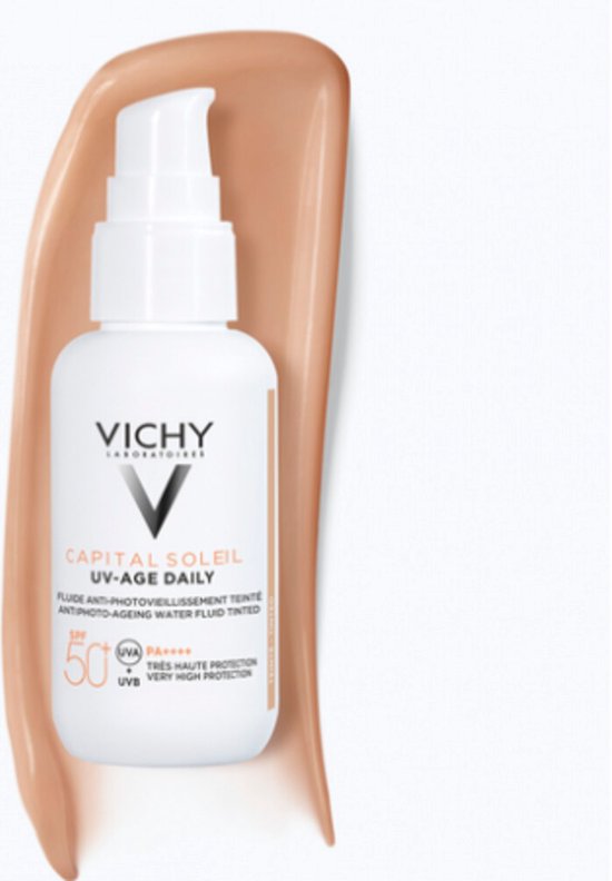 UV-AGE DAILY SPF 50+ van Vichy biedt hoge bescherming tegen UVA, UVB en zichtbaar licht om rimpels en pigmentvlekken veroorzaakt door de zon te helpen voorkomen. De ultralichte, vloeibare formule, verrijkt met de gepatenteerde* Netlock-technologie en actieve anti-aging ingrediënten, vormt een zeer resistente en onzichtbare barrière tegen UV. Klinisch bewezen effectieve werking tegen tekenen van foto-veroudering, zoals pigmentvlekken en gebrek aan volume. De formule biedt een lichte dekking om de huidteint te egaliseren en verrijken.*Netlock-technologie gepatenteerd door L’Oréal in Frankrijk. De formule van UV-AGE DAILY is ontwikkeld in onze laboratoria voor dagelijks gebruik, het hele jaar door: de ultravloeibare getinte textuur plakt niet, is niet vet, ademt en egaliseert de huidteint.Vermindert zichtbare tekenen van foto-veroudering: pigmentvlekken en gebrek aan volume.**Dermatologisch getest op een gevoelige huid.Hypoallergene en niet-comedogene formule.Prikt niet in de ogen, getest onder oftalmologisch toezicht.*****Klinische evaluatie van de kleurintensiteit van pigmentvlekken en volume van de huid onder 43 vrouwen die het product gedurende 56 dagen dagelijks gebruikten.***Formule minimaliseert het risico op prikkende ogen. Verrijkt met de gepatenteerde* NETLOCK-technologie.Bevat peptiden om de huid meer volume te helpen geven.2% Niacinamide om pigmentvlekken te voorkomen.Probiotische fracties & Vulkanisch water van Vichy, rijk aan 15 mineralen om de barrièrefunctie van de huid te versterken. *Netlock-technologie gepatenteerd door L’Oréal in Frankrijk.GEAVANCEERDE UV-BESCHERMENDE LAAGCapital Soleil UV-Age Daily is verrijkt met NETLOCK, een gepatenteerde* technologie gebaseerd op het emulsieprincipe: UV-filters zijn gevangen in micro geldruppels die een ultradunne, uniforme, resistente en beschermende laag op de huid vormen.EEN KRACHTIG SAMENSPEL VAN DERMATOLOGISCH ERKENDE ACTIEVE INGREDIËNTEN:2% NIACINAMIDE:Tegen pigmentvlekken.Bevat anti-aging peptiden.Bewezen effectiviteit tegen tekenen van huidveroudering. Vulkanisch water van Vichy:Versterkt de barrìerefunctie van de huid.Probiotische fracties:Versterkt de functies van de huidbarrière.*Netlock-technologie gepatenteerd door L’Oréal in Frankrijk.- 27% pigmentvlekken**.**Klinische tests van de kleurintensiteit van pigmentvlekken met beeldanalyse onder 43 vrouwen die het product gedurende 56 dagen dagelijks gebruikten.78% VINDT DAT DE HUID ER VOLLER UITZIET ******Zelfevaluatie, 63 personen, 8 wekenResultaten van de zelfevaluatie:- 97% van de gebruikers: de kleur is aangenaam. – 97% van de gebruikers: kan gelijkmatig aangebracht worden. – 88% van de gebruikers: het product wordt snel geabsorbeerd.