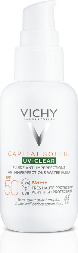 Dagelijkse uv-straling kan een vette huid, uitbraken en vlekjes verergeren. Vichy Capital Soleil UV-clear is verrijkt met de gepatenteerde Netlock-technologie en biedt SPF50+ en geavanceerde bescherming tegen UV-A en UV-B. De formule is zeer tolerant en dermatologisch getest. Klinisch bewezen resultaten: -66% puistjes * -31% glimmende huid* -32% pigmentvlekken* Poriën lijken bij 98% van de vrouwen kleiner** *Klinische score, 34 personen na 56 dagen. **Zelfevaluatie, 99 personen na 4 weken.Zeer hoge bescherming tegen UV-A en UV-BVoorkomt en vermindert vlekjes, onzuiverheden en een vette huidDermatologisch getest op een gevoelige huidPrikt niet in de ogen, getest onder oogheelkundig toezichtOngeëvenaarde, niet-comedogene textuur: ultralichte formule, niet olieachtig, niet vet en plakt niet, geen witte strepen bij 100% van de vrouwenDagelijks aanbrengen als laatste stap van je huidverzorgingsroutine: Stap 1: Vijf- tot zesmaal pompen. Stap 2: Aanbrengen op het gezicht met opwaartse bewegingen. Stap 3: Ook aanbrengen rond de ogen en op de hals.
