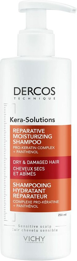 Vichy Dercos Technique Kera-Solutions Herstellende Shampoo is een verzorgende shampoo voor ruw, dof, broos haar.Chemische, mechanische & thermische agressoren beschadigen de haarstructuur intens en verminderen de keratine. Het haar raakt sterk beschadigd: ruw, dof, broos… Kera-Solutions Herstellende Shampoo combineert een micro-vullende formule* met een Pro-keratinecomplex om het haar met 1 toepassing te herstellen. In combinatie met Kera-Solutions Masque 2 min. Réparateur vermindert het schade aan het haar met 60%* *Instrumentele test op oppervlakteschade, shampoo + masker RESULTATENHERSTELT HET HAAR NA EERSTE GEBRUIKVOEDT DE HAARVEZELGEEN VERZWAREND EFFECTONMIDDELLIJK VERZACHTEND GEVOEL OP DE HOOFDHUIDVERBETERT DE ZACHTHEID & DE GLANS VAN HET HAARINSTRUMENTELE TESTRESULTATEN -60% anti-breken*48h anti-vochtigheid**Glans x33* Instrumentele tests op oppervlakteschade na gebruik van de shampoo & het masker** Instrumentele tests na gebruik van de shampoo & het masker +W41