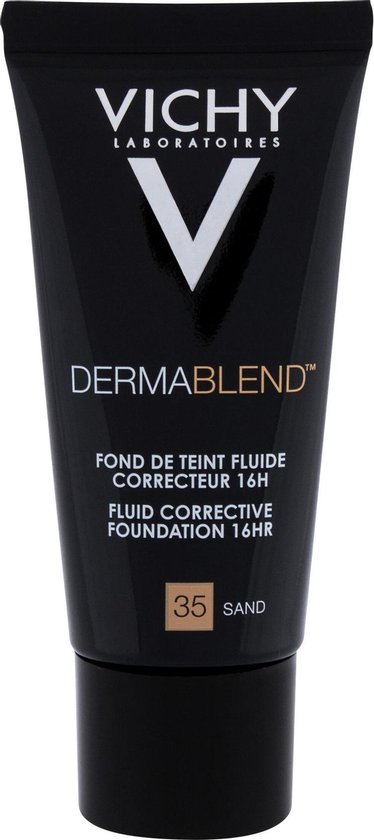 De Dermablend Corrigerende Vloeibare Foundation van Vichy biedt tot 16 uur lang een hoge dekking. Deze foundation is geschikt voor mensen die hun lichte tot matige onvolmaaktheden van de huid willen corrigeren, zoals een onregelmatige teint, rode vlekken, puistjes, en littekens. De Dermablend corrigerende vloeibare foundation combineert een hoge pigmentconcentratie, voor een perfecte dekking en een vlekkeloze afwerking, met een lichte, rekbare textuur. Dit zorgt ervoor dat de foundation samensmelt met de huid voor een natuurlijk resultaat en een comfortabel gevoel de hele dag door maar geen maskereffect creëert. De foundation dekt volledig en heeft een matte finish. Heeft een drievoudige werking: 1. Hoge dekking tot 16 uur lang zonder fijne lijntjes en rimpeltjes te accentueren;2. Een natuurlijk resultaat met een egale en stralende teint zonder maskereffect;3. Optimaal comfort: tot 24u hydratatie en een huid die soepel aanvoelt De hypoallergene formule met hoge huidtolerantie is dermatologisch getest op een gevoelige huid. Niet-comedogeen, APPLICATIE:1. Breng de Dermablend foundation met behulp van een sponsje of vingertoppen aan en maak lichte strijkbewegingen vanuit het midden naar de buitenkant van het gezicht. Breng bij opvallendere oneffenheden wat extra foundation aan door de betreffende zone aan te stippen en smeer het rondom lichtjes uit.2. Veeg de foundation bij de halscontouren, de oren en op het voorhoofd goed uit, om opvallende lijnen te voorkomen3. Breng meer aan, totdat de gewenste dekking is bereikt.