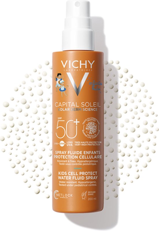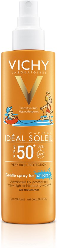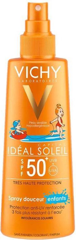 Vichy Ideal Soleil Spray Kids SPF50 Om de schadelijke gevolgen van UV A en UV B straling tegen te gaan en het waardevolle genetisch kapitaal van de huid te beschermen bevat deze spray een filtersysteem dat fotostabeiel is met een groot UVA UVB spectrum op basis van Mexoryl Kan makkelijk aangebracht worden en plakt niet Na het zweten zwemmen en afdrogen de spray op nieuw aanbrengen