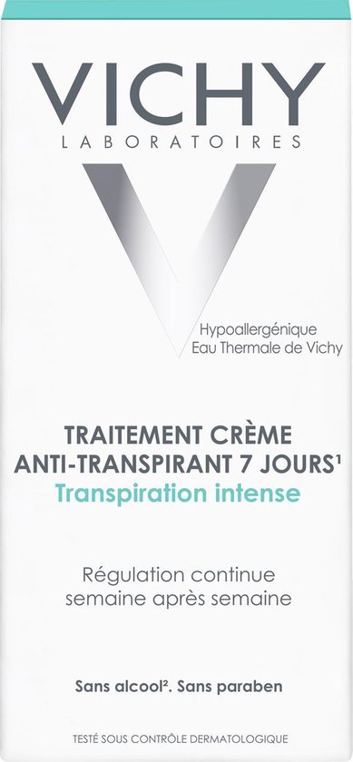 Deze anti-transpiratie deodorant crème van Vichy werkt tot 7 dagen lang tegen hevige transpiratie. Het beschermt de huid tegen overmatige vochtigheid dankzij de aanwezigheid van een hoge concentratie aluminiumchloorhydraat, een aluminiumzout dat zelfs door de gevoelige huid zeer goed wordt verdragen. De zweettoevoer is tot een week minder. De frisse geur van deze deodorant helpt nare geurtjes veroorzaakt door overmatige transpiratie te maskeren. De hypoallergene formule is dermatologisch getest en heeft een optimale tolerantie. Bevat geen alcohol.