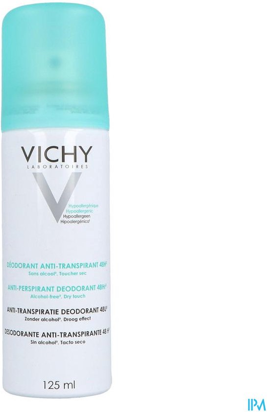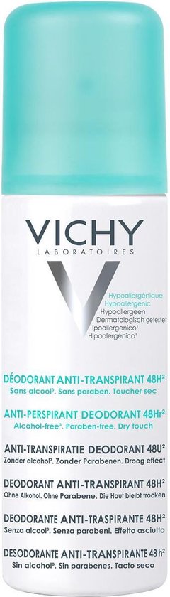 De Intense transpiratie deodorant van Vichy gaat tot 48u lang hevige transpiratie tegen. Deze geparfumeerde spray beschermt de huid tegen vochtigheid dankzij de aanwezigheid van aluminiumchloorhydraat, een aluminiumzout dat zeer goed door de huid wordt verdragen. De frisse geur helpt nare geurtjes, veroorzaakt door intense transpiratie, te maskeren. De hypoallergene formule bevat geen alcohol.