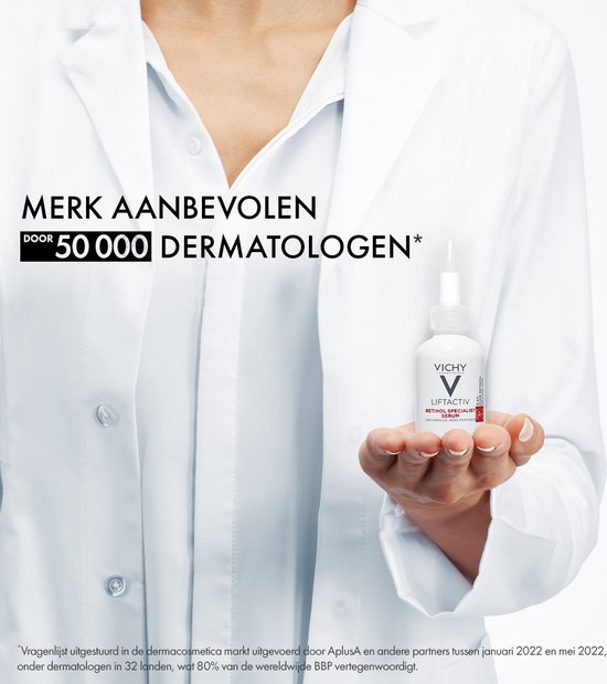 Liftactiv Retinol Specialist Serum is een anti-aging nacht serum. Vermindert alle type rimpels. Zelfs diepe rimpels. Ons nieuwe nachtserum wordt aangedreven door een superieur anti-aging complex dat alle soorten rimpels aanpakt, zelfs de diepste.Na verloop van tijd wordt de huid minder stevig, verschijnen er rimpels en fijne lijntjes. Deze tekenen van huidveroudering worden versterkt doorexterne agressoren (vervuiling, UV, stress, enz.).Om zelfs de diepste rimpels te corrigeren, hebben de Laboratoria van Vichy een antiverouderingsserum samengesteld dat alle soorten rimpels kan bestrijden: het nachtserum Liftactiv Retinol Specialist Serum. Met een zeer doeltreffend anti-ageing complex dat 0,2% pure retinol combineert met probiotische fracties, corrigeert dit serum alle soorten rimpels, zelfs de diepste. De herstellende werking verfijnt en egaliseert de huidstructuur.