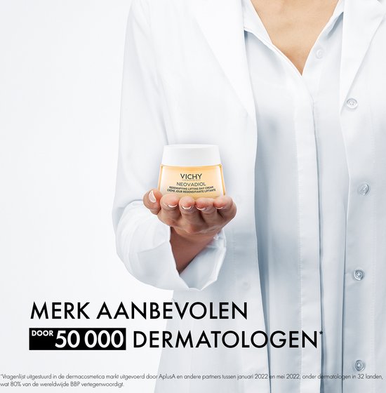 Neovadiol Verstevigende, Liftende anti-aging Dagcrème vermindert rimpels, volgens onderzoek Volgens een instrumentele test onder 40 vrouwen: • +24% veerkrachtiger na 4 uur. Volgens cosmeto-klinisch onderzoek onder 219 vrouwen na 3 maanden: • 28% minder rimpels; • 25% minder slappe huid onderin het gezicht.