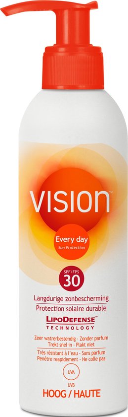 Vision Every Day Sun Protection Zonnebrand Pomp SPF30 beschermt langdurig* tegen de schadelijke UVA- & UVB-stralen van de zon en is tevens zeer waterbestendig. De lotion is 100% parfumvrij en trekt zeer snel in, waardoor de huid niet vet en plakkerig aanvoelt. • Langdurige zonbescherming tegen UVA- en UVB-straling• 100% parfumvrij• Zeer waterbestendig• Trekt snel in en plakt niet• Zonnebrand voor lichaam & gezicht• Geschikt voor kinderen en volwassenen*Afhankelijk van zonkracht, huidtype en beschermingsfactorHoe te gebruiken?• Breng Vision minimaal 15 minuten voor het zonnen aan op de huid. Vision treedt in werking wanneer de huid wordt blootgesteld aan daglicht.• Smeer royaal (als volwassene 35 ml per keer), regelmatig en zorgvuldig. • Zonbeschermingsproducten regelmatig (om de twee uur) opnieuw aanbrengen, vooral na zwemmen, afdrogen of transpiratie. • Bij minder gebruik dan de aanbevolen hoeveelheid, daalt de bescherming sterk. • Overmatige blootstelling aan zonlicht is gevaarlijk voor de gezondheid.