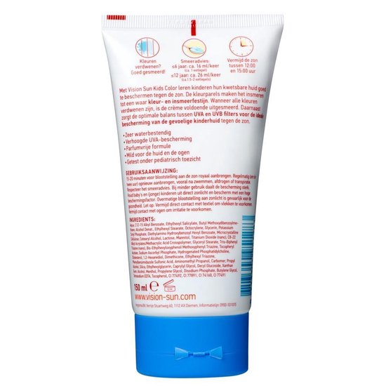 De geïntegreerde kleurparels in Vision Sun Kids Color veranderen de witte lotion in een kleurenexplosie waar jong en oud plezier aan beleven. En wanneer alle kleuren verdwenen zijn, weet je dat je kind goed beschermd is. Met Vision Sun Kids Color leren kinderen hun kwetsbare huid goed te beschermen tegen de zon. De kleurparels maken het insmeren tot een waar kleur- en insmeerfestijn. Wanneer alle kleuren verdwenen zijn, is de crème voldoende uitgesmeerd. Daarnaast zorgt de optimale balans tussen UVA- en UVB-filters voor de ideale bescherming van de gevoelige kinderhuid tegen de zon.