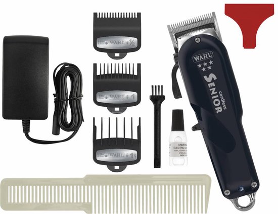 Met de Wahl Senior Cordless Tondeuse wordt het volgende geleverd: 1.5mm/3mm/4.5mm opzetkammen, tondeusekam, kleine tube olie, kleine reinigingsborstel, oplader en snijmes beschermer.