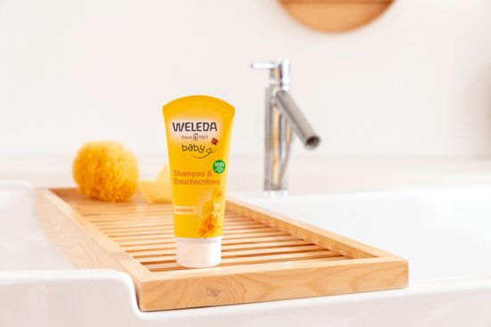Weleda Calendula Babyshampoo & Douchecrème is geschikt voor alle leeftijden. Het is al vanaf de eerste dag te gebruiken en geschikt voor dagelijks gebruik. Zowel voor een uitgebreide badbeurt als voor de dagelijkse reiniging van het gezichtje en het luiergebied. Verdeel de crème met een washandje, spons of gewoon met je handen over de haartjes en het lijfje. Laat het licht schuimen en spoel daarna goed af.