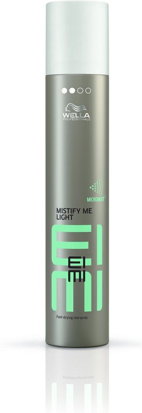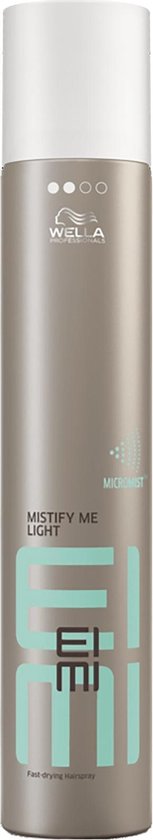Wella EIMI Mistify Me Light is een finishing spray met een zeer lichte en sneldrogende formule. Een lichtgewicht een een sneldrogende haarspray. Dit is te danken aan de MicroMist-technologie: een exclusieve combinatie van een kleiner ventiel, een soft-swirl aandrijving, een nieuwe formule en een drijfgas systeem voor kleinere druppeltjes en een extra fijne verspreiding. Alles wat je nodig hebt voor een perfecte finish. Geef direct een lichte versteviging aan je look. Deze lichtgewicht formule met een ultrafijne nevel, voor lichte fixatie tot wel 24 uur, kan gemakkelijk worden uitgeborsteld.