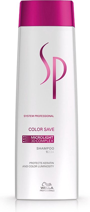 Wella SP Color Save Shampoo is een shampoo die speciaal ontwikkeld is voor gekleurd haar. De shampoo zorgt voor een langdurige kleurglans en beschermt tegen kleurvervaging en –verandering. Ook zorgt dit product ervoor dat gekleurd haar er weer gezond en verzorgd uitziet. Wella SP Color Save Shampoo levert extra voeding en een mooie glans. De formule heeft een UV-filter, waardoor het haar extra kleurbescherming krijgt tegen UV-licht. Dermatologisch getest op huidvriendelijkheid.