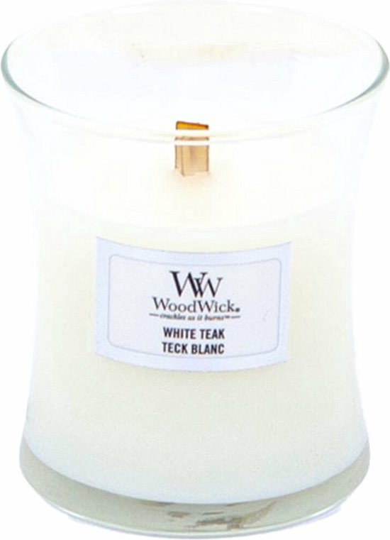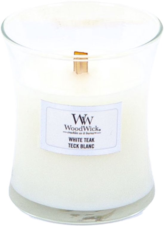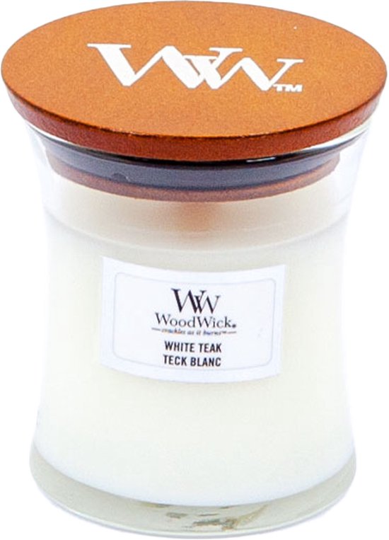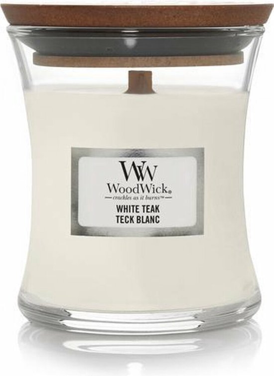 WoodWick White Teak Mini Candle is een mooie aanvulling in jouw interieur! De geurkaarsen van WoodWick hebben een uniek knisperend houten lont. De geuren zijn met zorg samengesteld en uitgebreid getest, en zorgen voor een heerlijke geur én sfeer in jouw huis. WoodWick White Teak is een houtige geur. Ontdek de aroma’s van balsemtakken gemixt met sandelhout en eikenhout. De top- en middennoten bestaan uit lavendel, sandelhout, balsem en eikenhout. De basisnoten bestaan uit teakhout en mos De basisnoten bestaan uit teakhout en mos.
