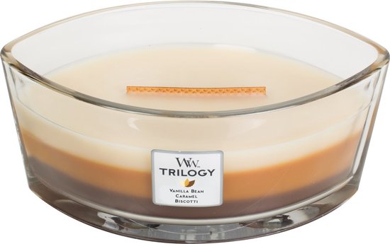 De WoodWick Trilogy Hourglass Ellipse geurkaars – Café Sweets creëert een unieke geurbeleving terwijl de lagen samensmelten.