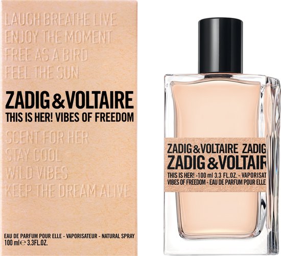 Zadig Voltaire This is Her Vibes of Freedom is een Houtachtig Bloemige Musk geur voor dames De Parfumeur achter dit parfum is Sidonie Lancesseur De topnoten zijn Peer en Pioenroos De hartnoten zijn Jasmijn en Roos De basisnoten zijn Kastanje en Slagroom Dit parfum werd uitgebracht in 2022