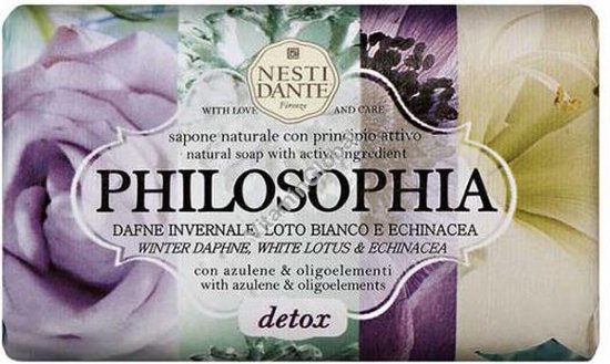 Deze traditionele zeep van Nesti Dante Luxe kwaliteitszeep bevat azuleen en magnesium. De liefde voor de natuur staat centraal in deze zepen met actieve huidverzorgende ingrediënten. De Philosophia Detox zeep combineert de regenererende en ontgiftende werking van azuleen en magnesium met de intense geur van winter daphne , echinacea en witte lotusbloem. Met liefde en zorg gemaakt.
