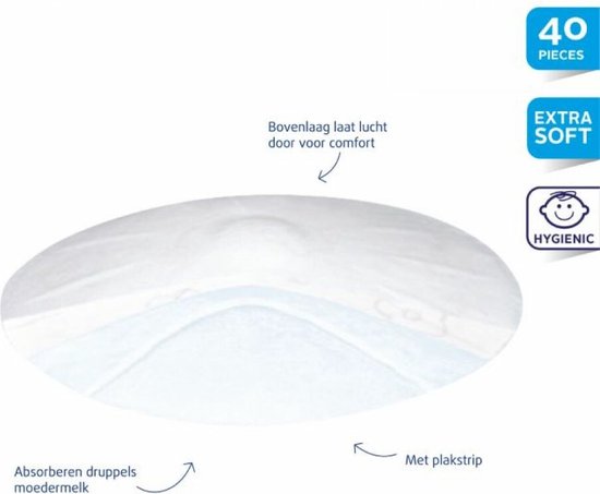 Zachte en comfortabele borstkompressen die de melkdruppels opvangen die uit de tepel komen. De uiterst dunne absorberende kern biedt bescherming tegen lekkage. De bovenlaag laat lucht door en is ademend. De plakstrip aan de buitenkant zorgt ervoor dat de kompres op zijn plek blijft.